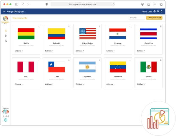 Mango Datagraph cumplió un papel crucial en la aplicación oficial del torneo Copa América Centenario 2016, ya que proporcionó información esencial del torneo tanto a la aplicación móvil como al sitio web. Brindó soporte administrativo, mientras que nuestro equipo administró el flujo de datos y facilitó la compartición fluida de videos relacionados en plataformas de redes sociales.